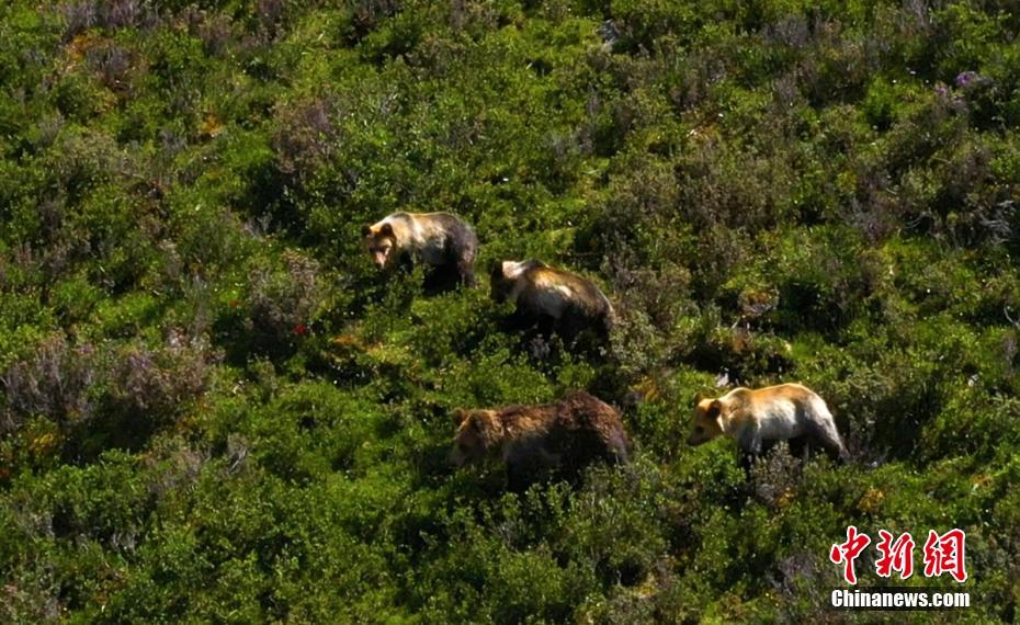 棕熊媽媽帶著3隻熊寶寶行走在山坡上。秦晉翔 攝