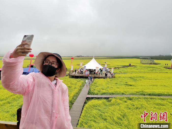 記者在油菜花海內(nei) 看到,雖然當天下著雨,仍然有前來遊玩的遊客,當地市民趙金花說,疫情後這是他們(men) 一家人第一次來油菜花海遊玩,走在一望無際的花海裏心情特別輕鬆。