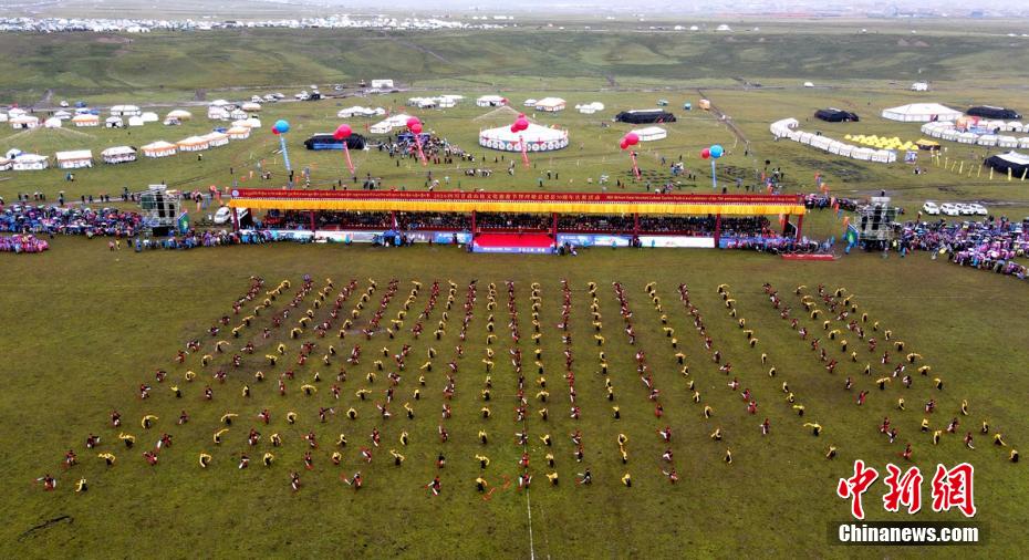 航拍山地文化旅遊節開幕式上的鍋莊表演。 劉忠俊 攝