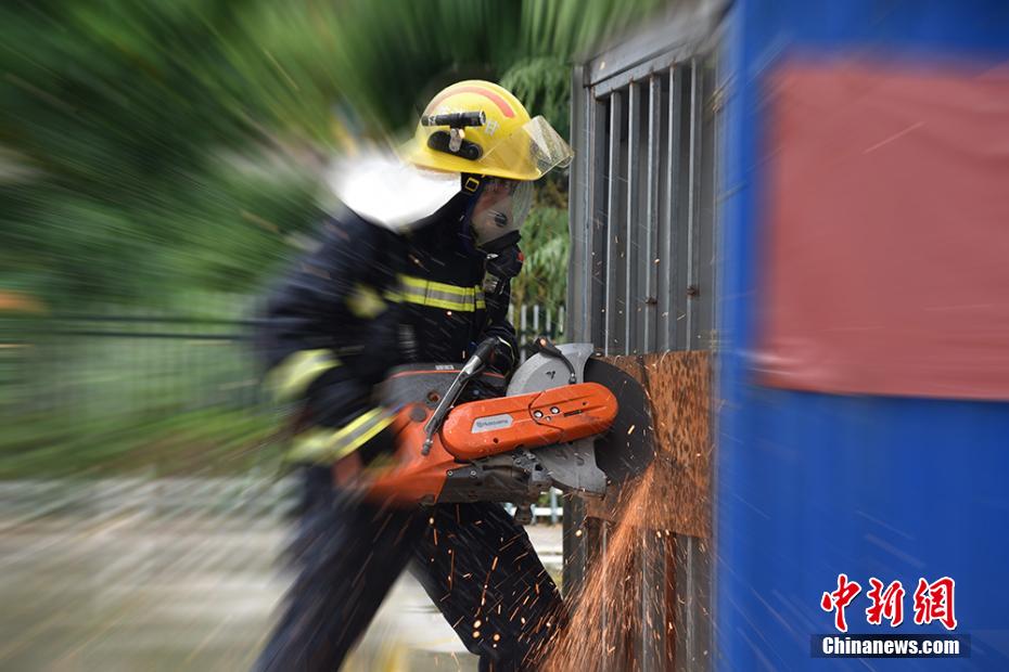 圖為(wei) 消防員利用無齒鋸對障礙物進行破拆。 婁淵燾 攝