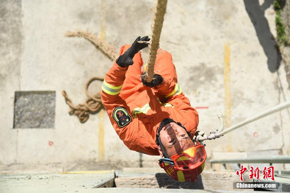 圖為(wei) 消防員借助慣性縱身躍起,向高處爬升。 婁淵燾 攝