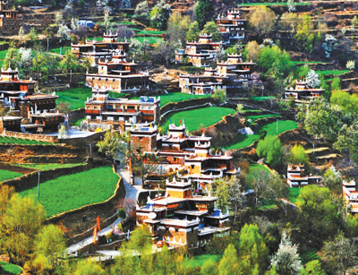 相對高差近千米的山坡上,一幢幢藏式樓房分布在綠樹叢(cong) 中,陽光從(cong) 雲(yun) 的縫隙間投射在山坡上,錯落有致,恬靜安寧。