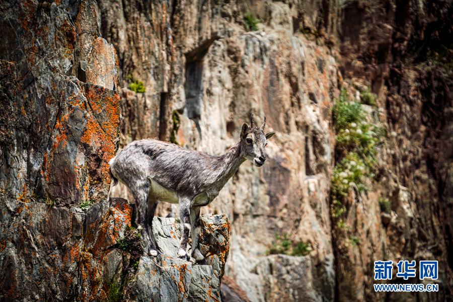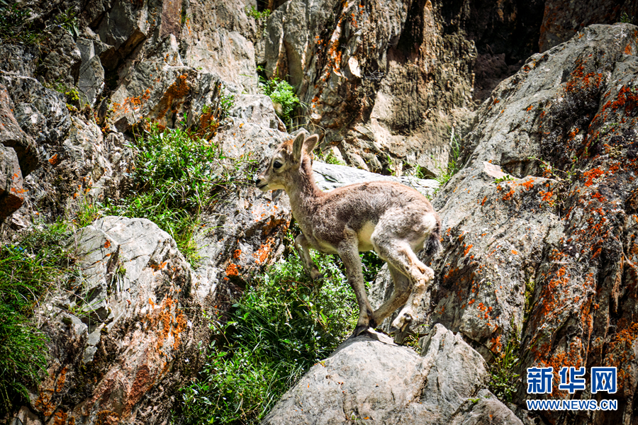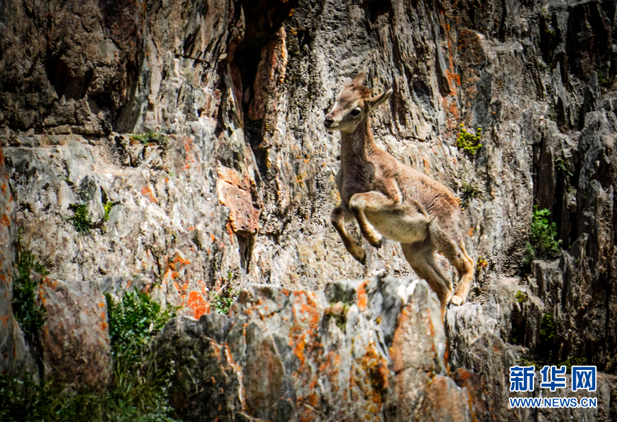 一隻小岩羊在岩壁上嬉戲。新華網 宋忠勇 攝