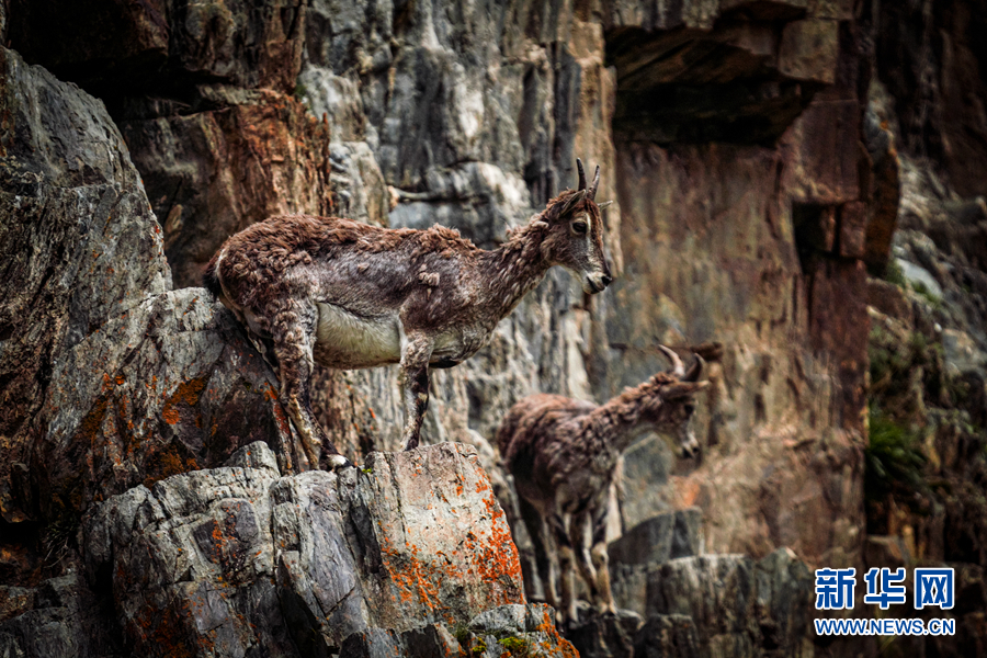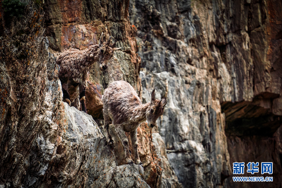 兩(liang) 隻岩羊站在岩壁上俯瞰。新華網 宋忠勇 攝