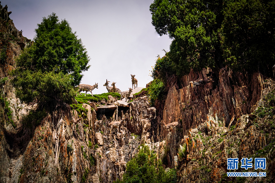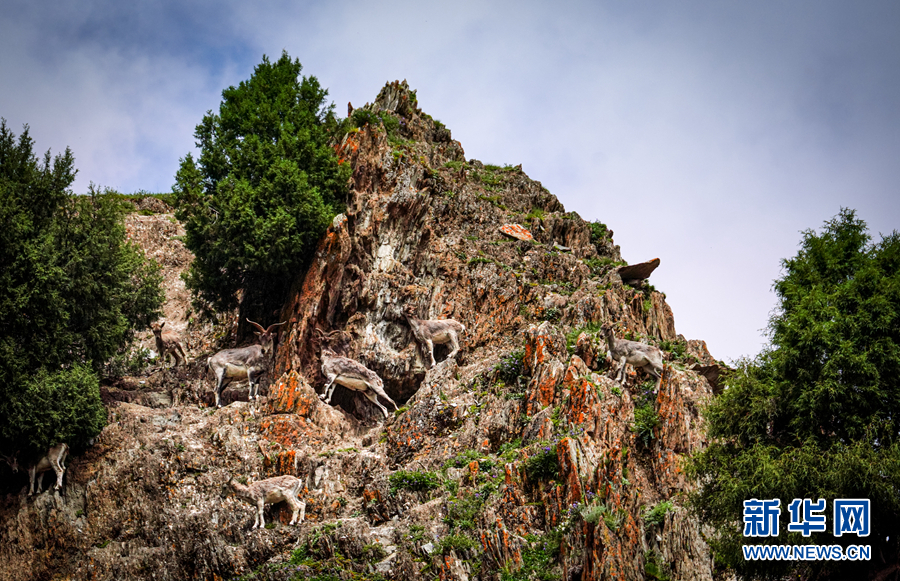 一群岩羊在岩壁上嬉戲。新華網 宋忠勇 攝