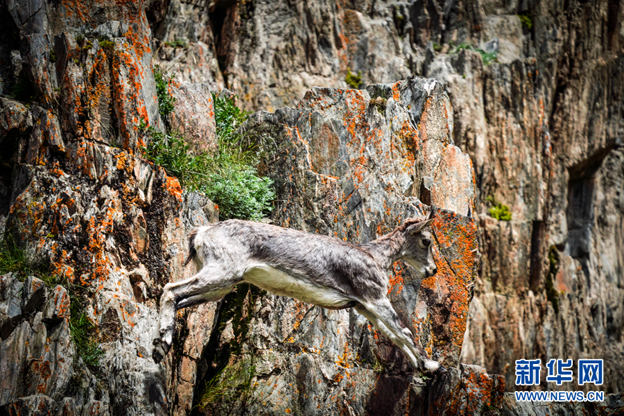 一隻岩羊在岩壁上跳躍。新華網 宋忠勇 攝