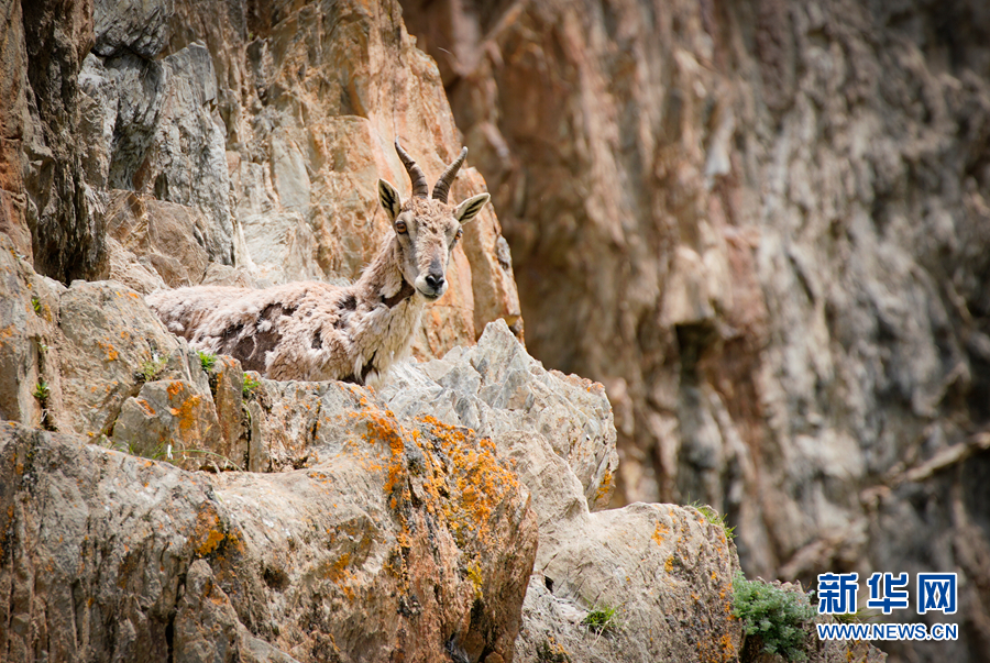 一隻岩羊站在岩壁上眺望。新華網 宋忠勇 攝