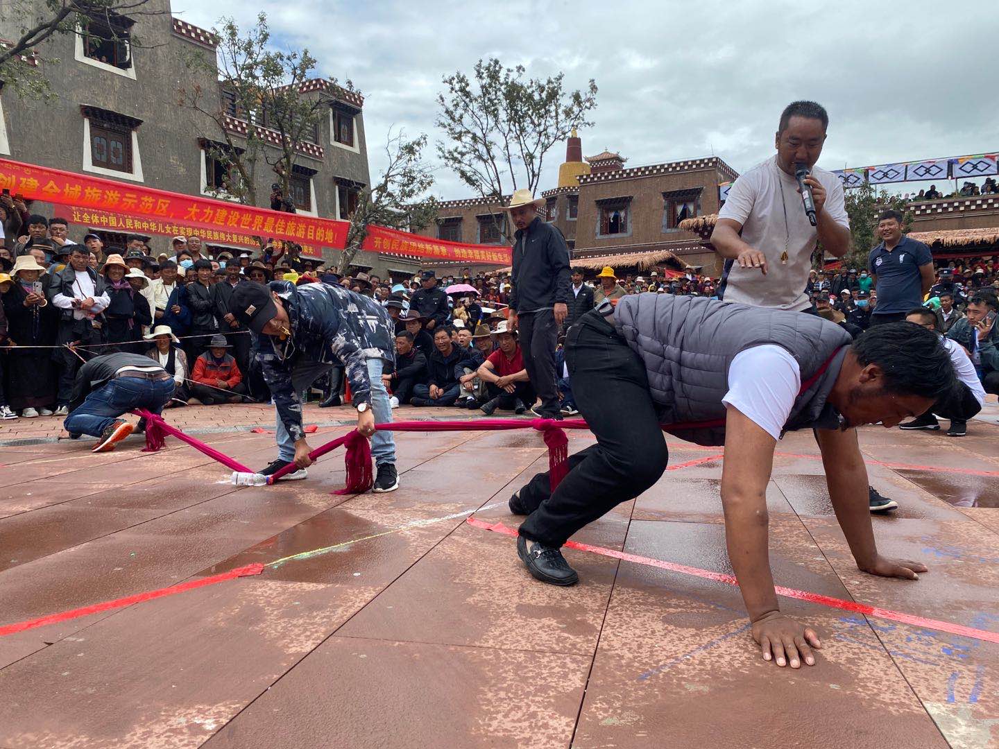 現場兩(liang) 名運動員俯下身去,脖子上套上同一根長綢布帶,正在做著賽前的準備工作。“嗶——”一聲哨響過後,雙方運動員四肢著地,往相反的方向奮力爬行,布帶隨之被拉直繃緊,賽場氣氛也隨即變得緊張……這種趴著拔河的體(ti) 育項目叫做格吞,也叫“藏式拔河”。