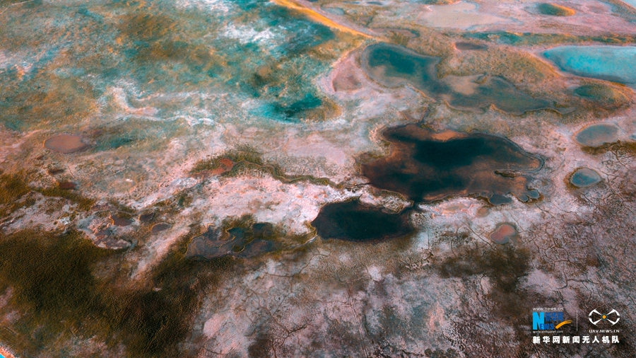 天空中的晚霞與(yu) 地上的湖泊形成了獨特的美景。(航拍圖)新華網 宋忠勇 攝