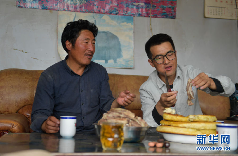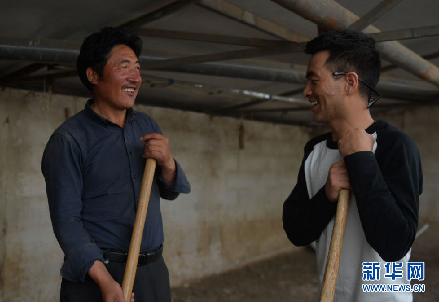 8月13日,尤拉太(左)和父親(qin) 尕藏本在自家的羊圈內(nei) 交談。新華社記者 張宏祥 攝