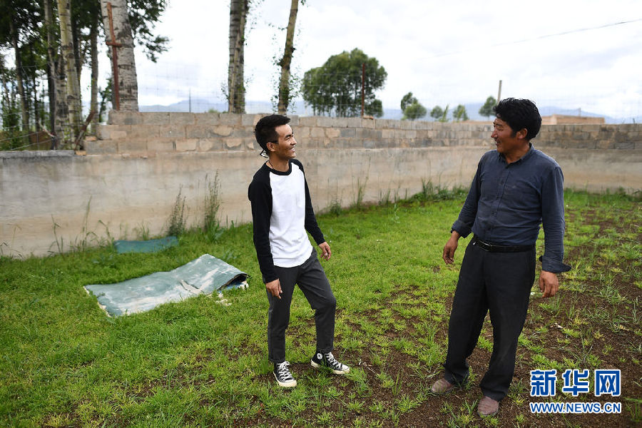 8月13日,在夏塘村,尤拉太(右)與(yu) 父親(qin) 在幹活間歇聊天。新華社記者 張龍 攝