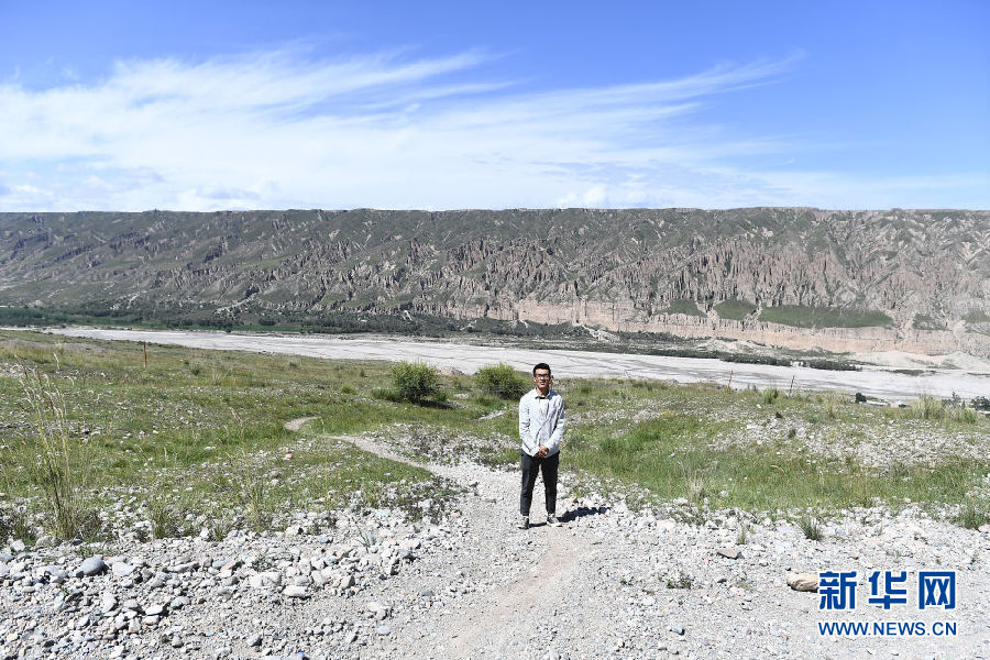 8月13日,尤拉太在夏塘村留影,他身後的山路是他上小學時步行前往學校的必經之路。新華社記者 張宏祥 攝