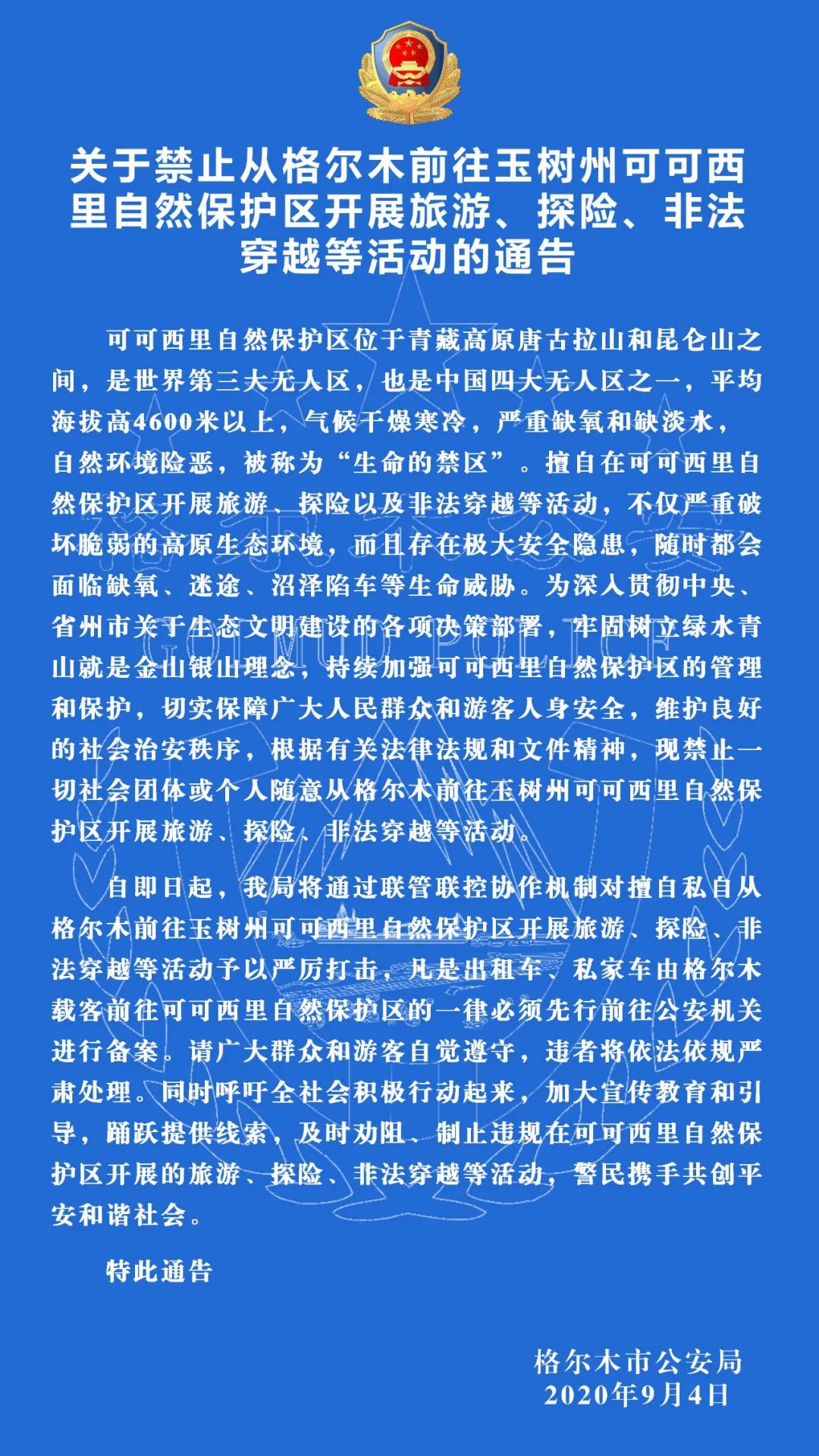 據格爾木公安微信公眾(zhong) 號消息,9月4日,青海省格爾木市公安局發布通告,禁止一切社會(hui) 團體(ti) 或個(ge) 人隨意從(cong) 格爾木前往玉樹州可可西裏自然保護區開展旅遊、探險、非法穿越等活動,即日起將對上述行為(wei) 予以嚴(yan) 厲打擊,凡是出租車、私家車由格爾木載客前往可可西裏自然保護區的一律必須先行前往公安機關(guan) 進行備案。