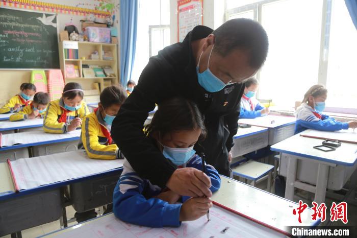“排好隊,我們(men) 要量體(ti) 溫了。”教室外,完麽(me) 仁增蹲在椅子旁,用手持紅外線測溫儀(yi) 挨個(ge) 兒(er) 為(wei) 孩子們(men) 測量體(ti) 溫並逐一登記,起身時他有點吃力,“這是我帶的第28屆學生。”他說。