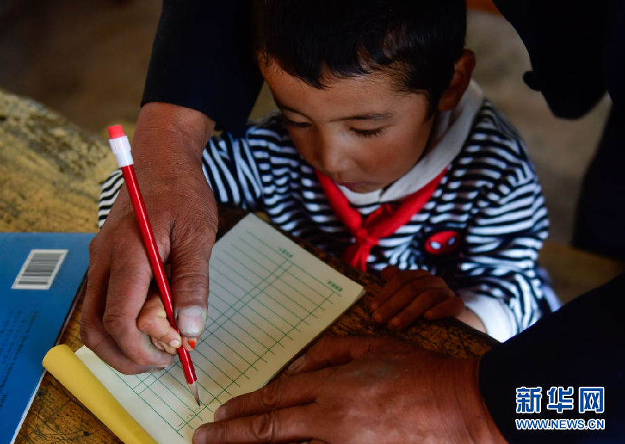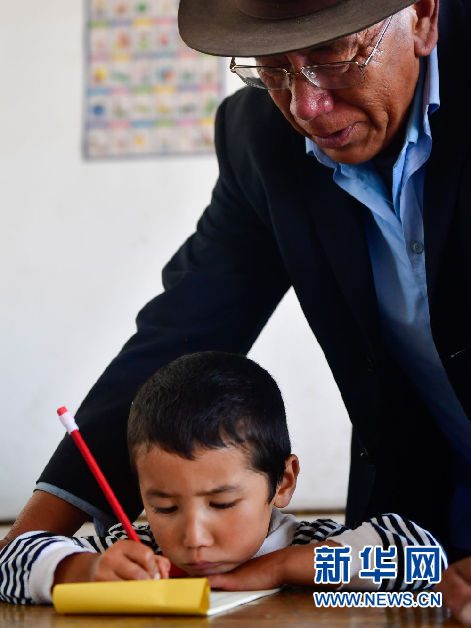 8月31日,在來塘村學校,完麽(me) 仁增老師在指導一年級學生馬文輝學習(xi) 。新華社記者 張龍 攝