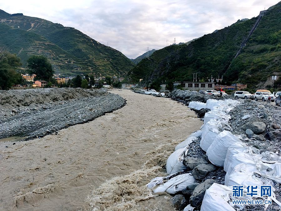這是舟曲縣曲告納鎮一處用沙袋修築的河堤。新華網發(張靜 攝)