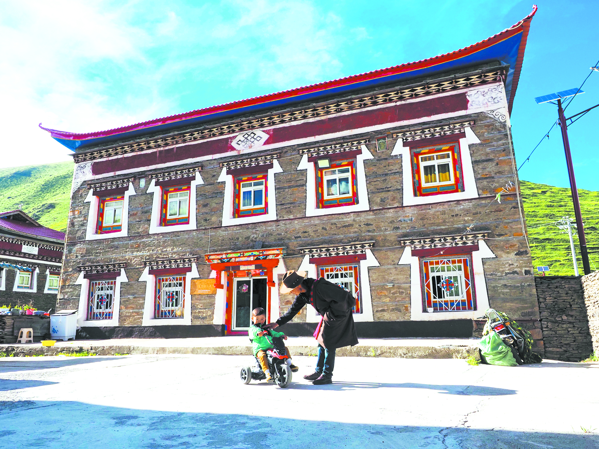 丁真汪秋陪兒(er) 子在自家改造的民居前玩耍。於(yu) 譚陽 攝