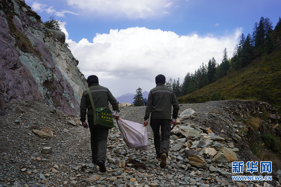 祁連山國家公園青海片區油葫蘆管護站的生態管護員在撿拾垃圾(9月9日攝)。新華社記者 藍翔 攝