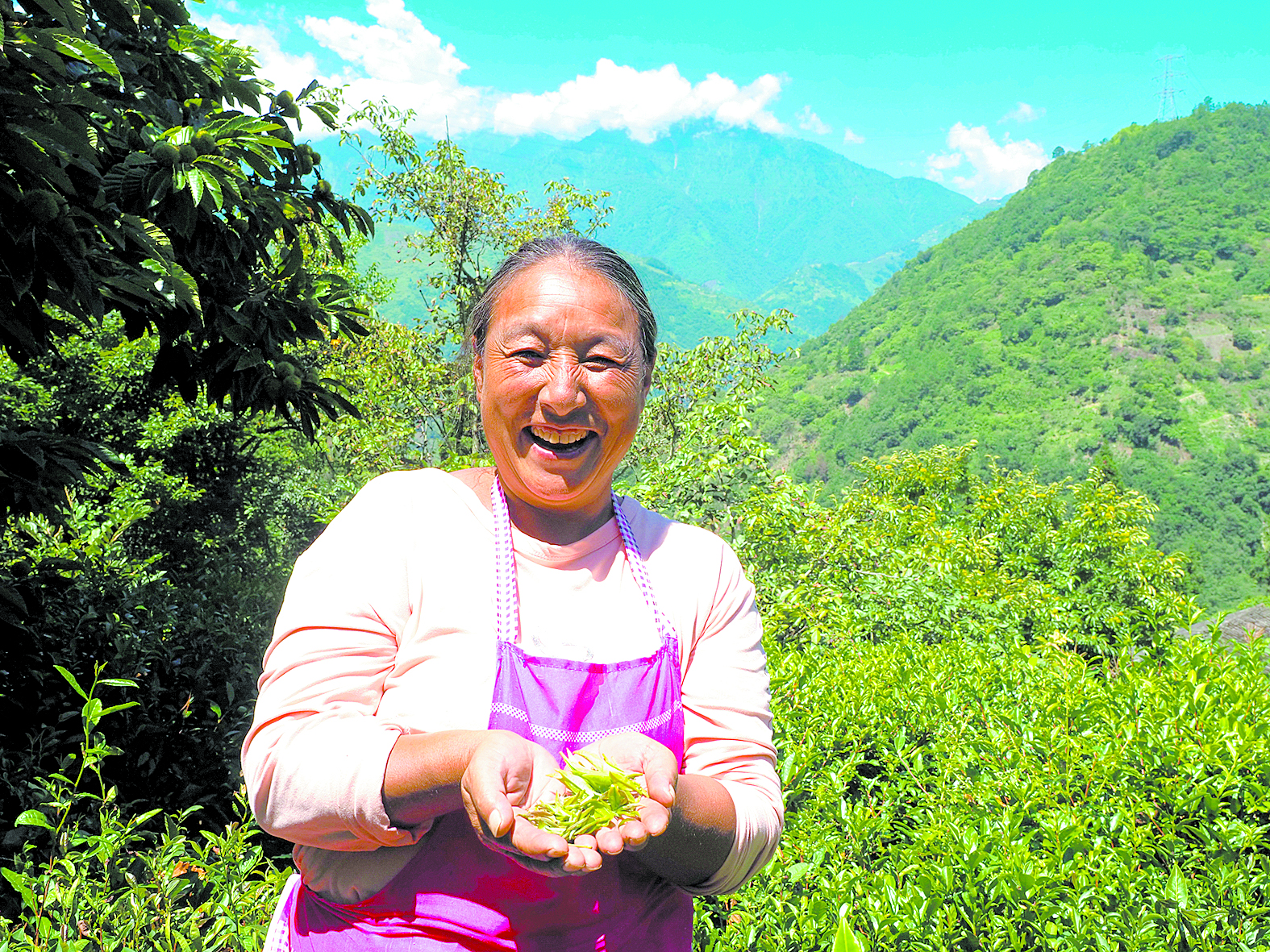 收獲新茶後,紫雅場村村民王美蓉喜笑顏開。於(yu) 譚陽 攝