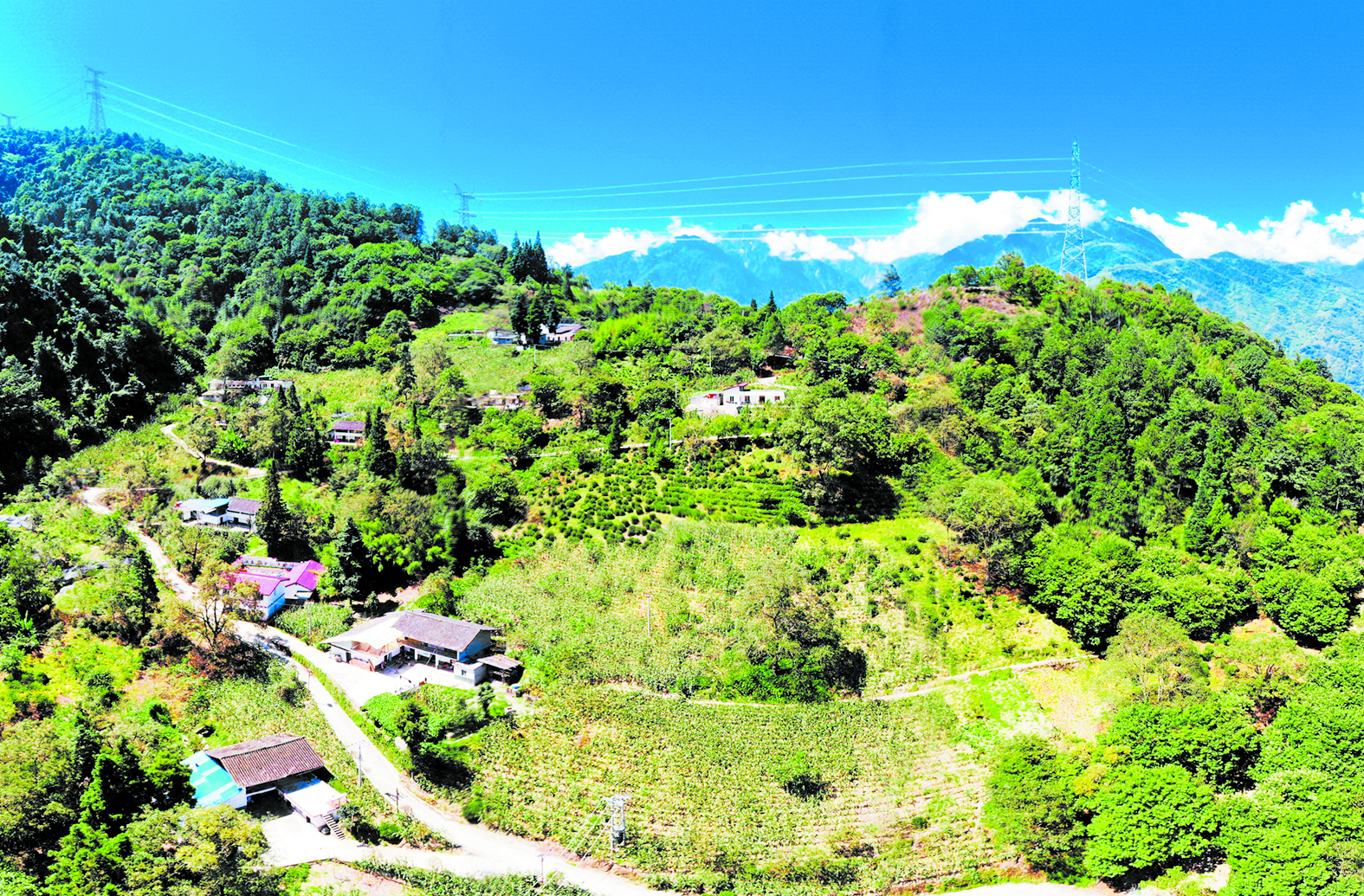從(cong) 奔騰的大渡河穀一路向上,海拔1800多米的甘孜州瀘定縣得妥鎮紫雅場村,樹林連綿成片,山頂雲(yun) 霧繚繞,山坡上的茶園反射著陽光,在藍天的映襯下格外青翠。