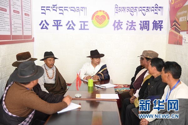 “官卻個(ge) 人調解工作室”(中為(wei) 官卻)為(wei) 當地群眾(zhong) 調解矛盾糾紛。新華網 潘彬彬 攝