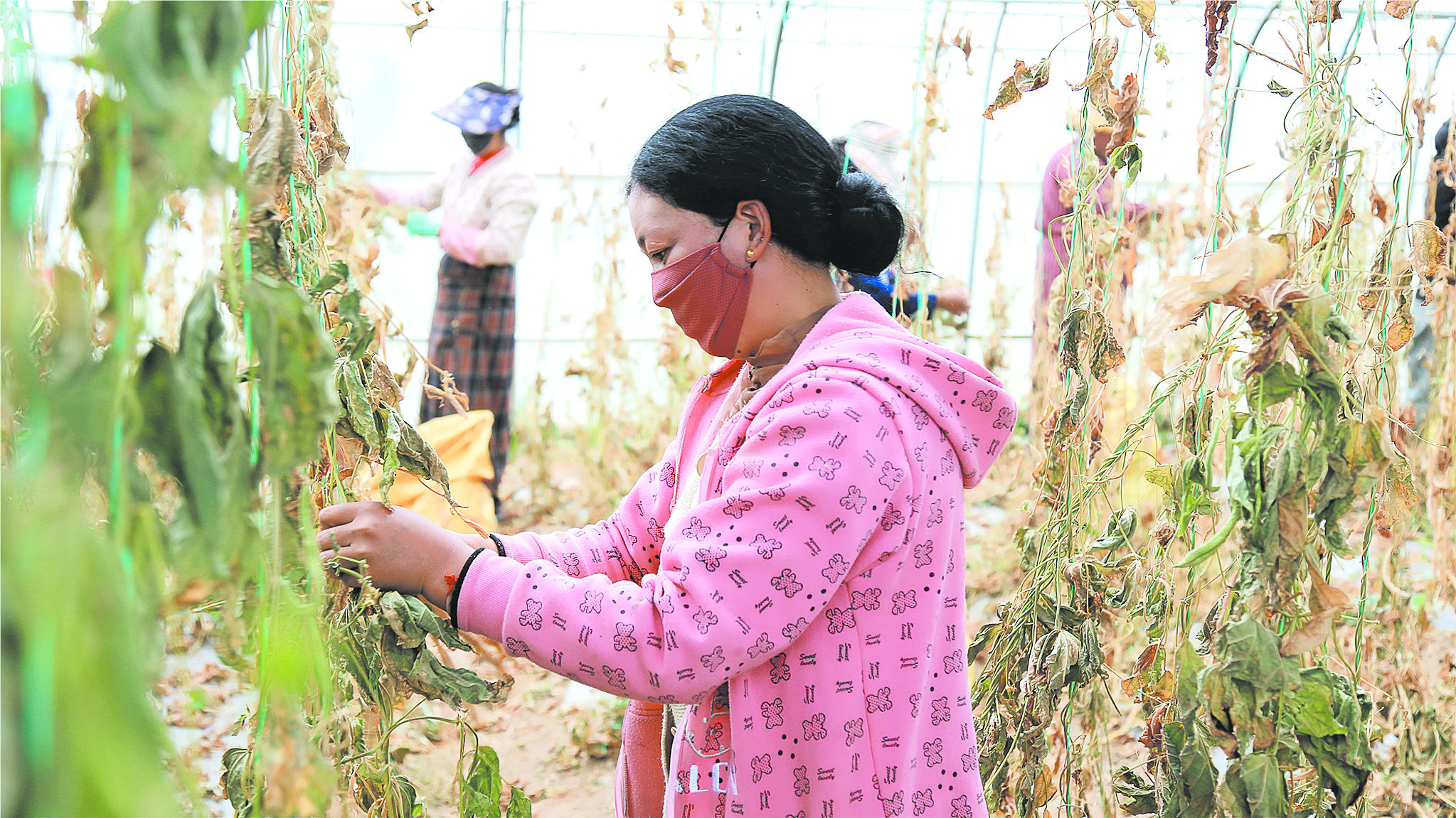 正是收獲時節,在種植無筋豆種的大棚裏,根窮卓瑪和其他村民正把成熟後已經枯黃的無筋豆莢從(cong) 藤上摘下來。