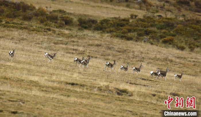 圖為(wei) 臀部呈白色桃心的藏原羚排隊奔跑。三江源國家公園森林公安局 供圖
