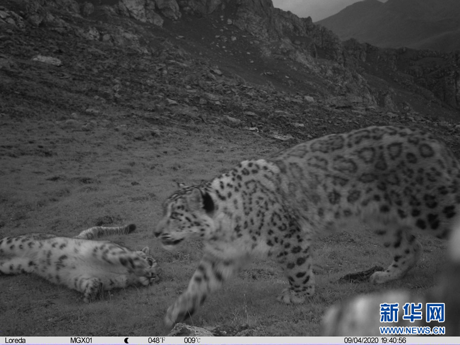這是9月4日在祁連山東(dong) 端的青海省海東(dong) 市互助土族自治縣北山林場拍攝到的雪豹母子玩耍嬉戲的影像。新華社發