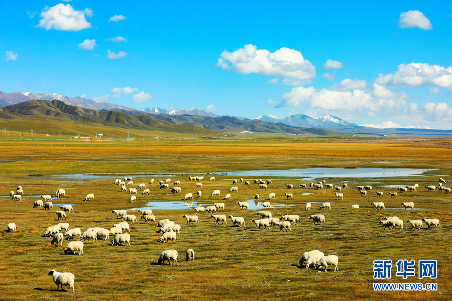 藍天白雲(yun) 之下,羊群悠閑自在地吃著草,與(yu) 草原相映成趣。新華網 蘇金元 攝