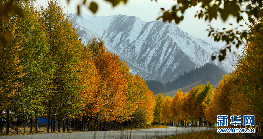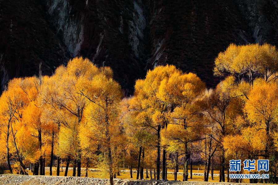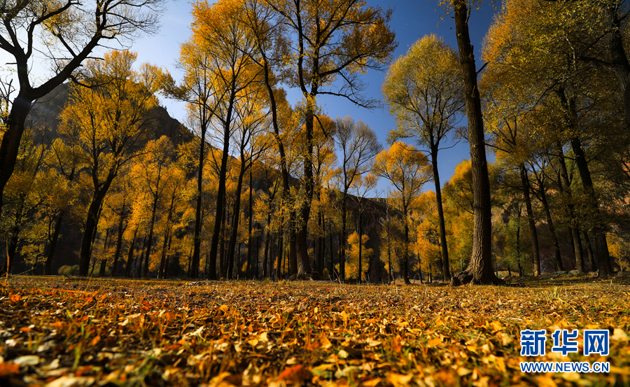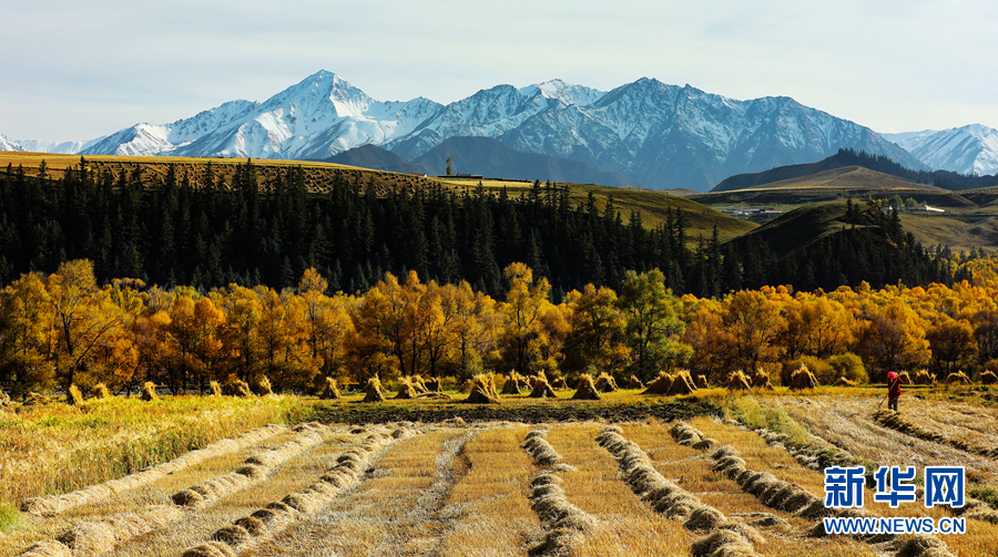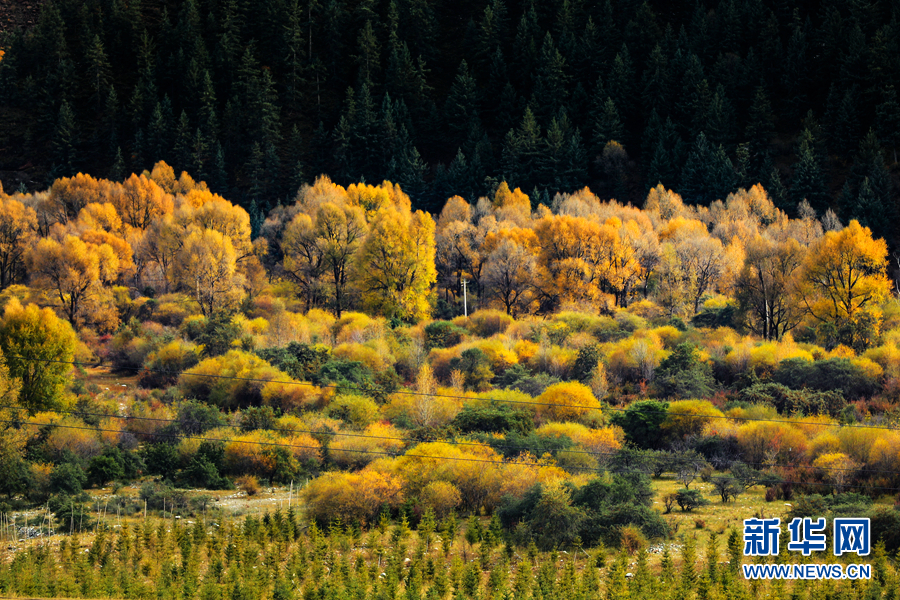 金黃色的樹木與(yu) 遠山交相輝映,處處呈現出醉人的美景。新華網 蘇金元 攝