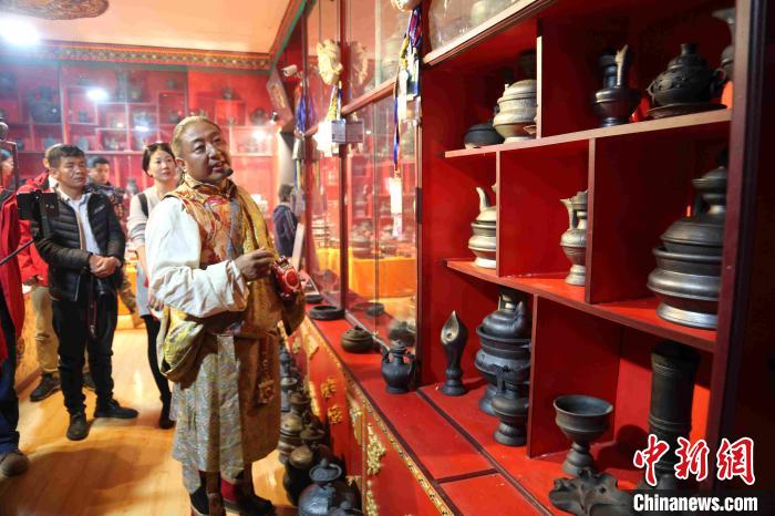 圖為(wei) 青海省玉樹藏族自治州囊謙縣的國家級“非遺”傳(chuan) 承人白瑪群加介紹藏族黑陶手藝。張添福 攝