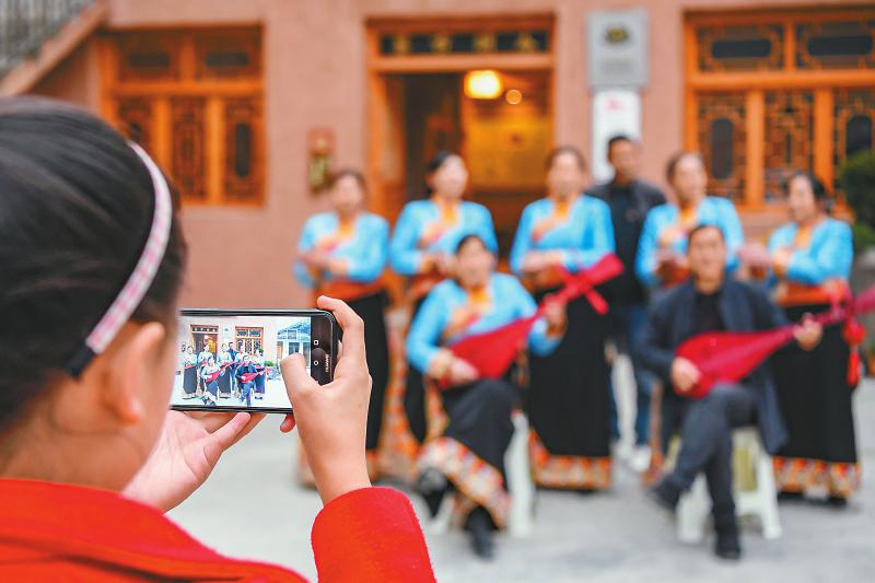 九寨溝縣郭元鄉(xiang) 青龍村村民用土琵琶彈唱《十唱柴門關(guan) 》歌謠,吸引遊客拍照。蘇楊 攝
