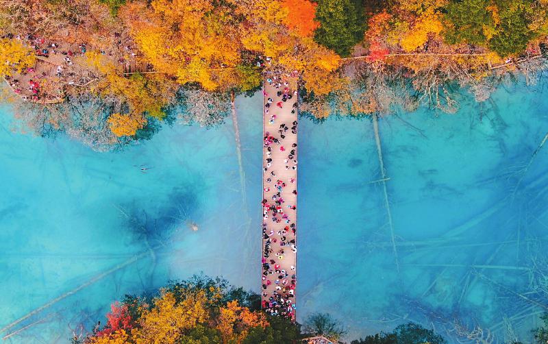 深秋的九寨溝景區,五花海景點引來遊客觀賞彩林、海子。 蘇楊 攝