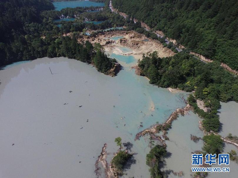 這是2017年九寨溝遭遇地震後的火花海景點(2017年8月9日攝,無人機照片)。新華社發