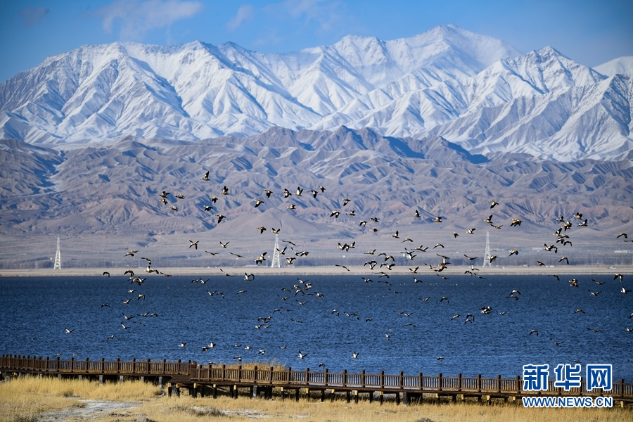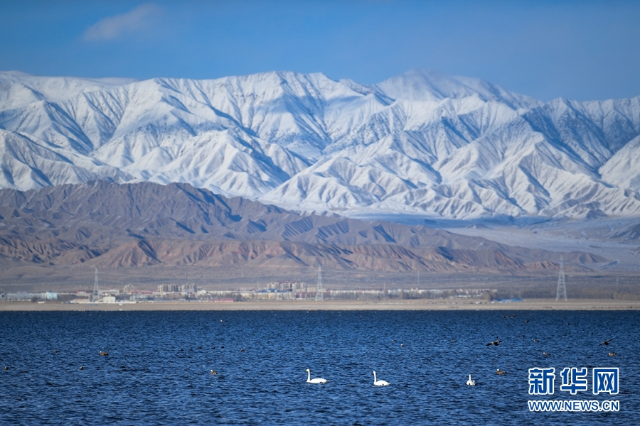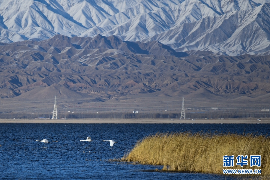 大天鵝、赤麻鴨在都蘭(lan) 湖遊弋。(11月21日攝) 新華網 潘彬彬 攝