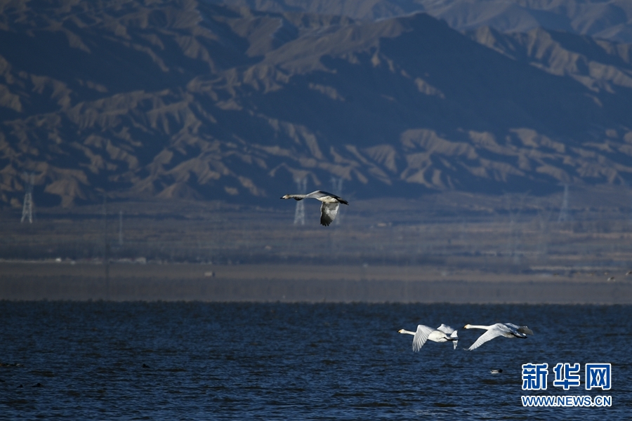三隻大天鵝在都蘭(lan) 湖國家濕地公園上空飛翔。(11月21日攝) 新華網 潘彬彬 攝