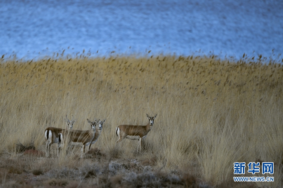 四隻鵝喉羚在都蘭(lan) 湖國家濕地公園內(nei) 活動。(11月21日攝)新華網 潘彬彬 攝