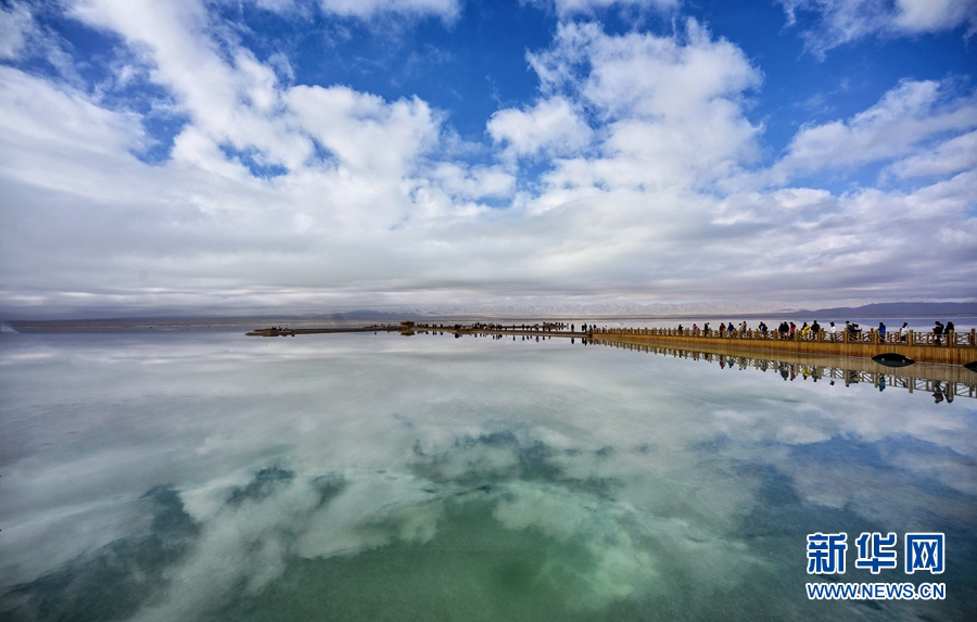 茶卡鹽湖水天一色,景色唯美。新華網發(宋忠勇攝)