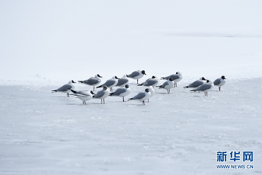 一群水鳥棲息在青海湖的冰麵上。(資料圖)新華社記者 張龍 攝