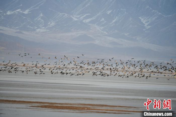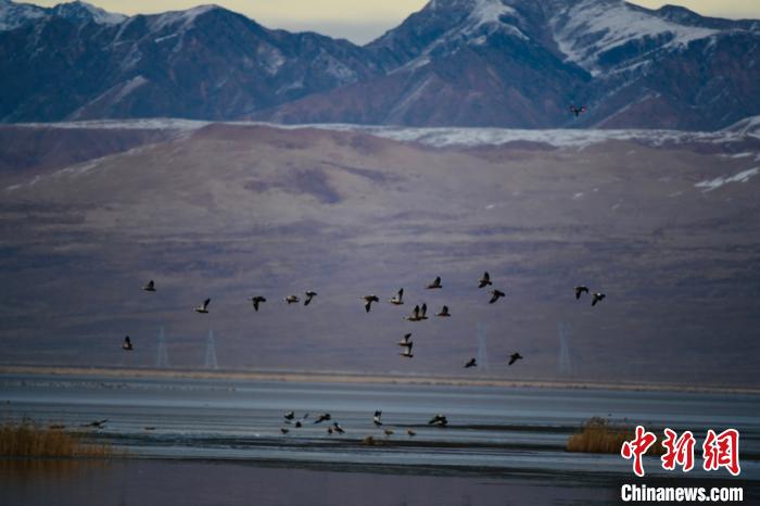 12月隆冬時節,柴達木盆地都蘭(lan) 湖濕地公園迎來大天鵝、白骨頂雞、棕頭鷗、赤麻鴨等數萬(wan) 隻野生鳥類越冬棲息,為(wei) 冬季的柴達木盆地增添了一份美麗(li) 與(yu) 靈動,呈現了勃勃生機。