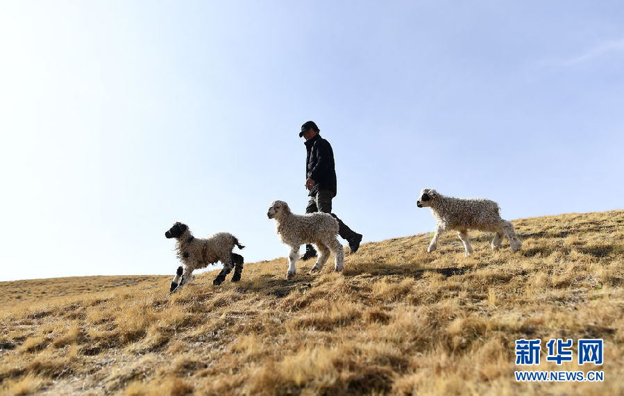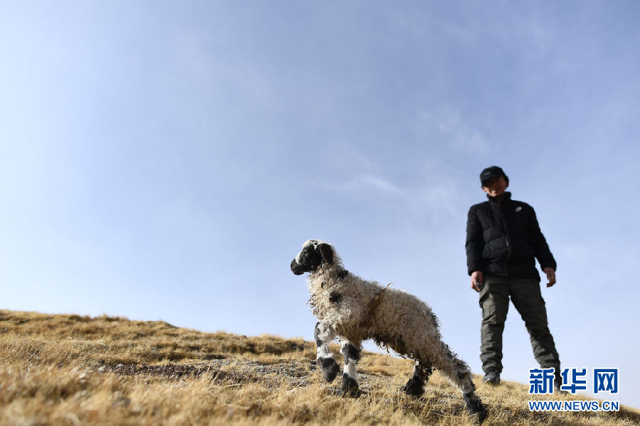 在青海省剛察縣泉吉鄉(xiang) 寧夏村,彭毛太和剛出生不久的小羊羔在一起(11月20日攝)。 新華社記者 張宏祥 攝