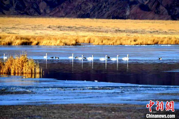 12月隆冬時節,在柴達木盆地都蘭(lan) 湖國家濕地公園內(nei) ,攝影師拍攝到前來“越冬”的大天鵝種群。