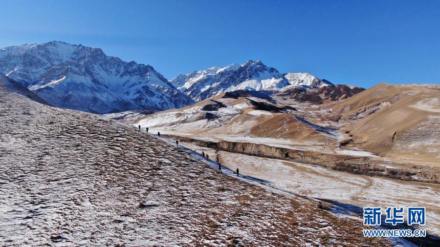 12月8日,祁連山國家公園紮麻什管護站生態管護員在巡護途中(無人機照片)。新華社記者 張宏祥 攝
