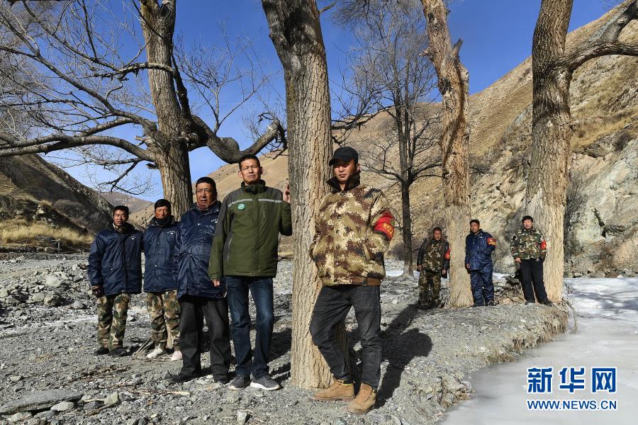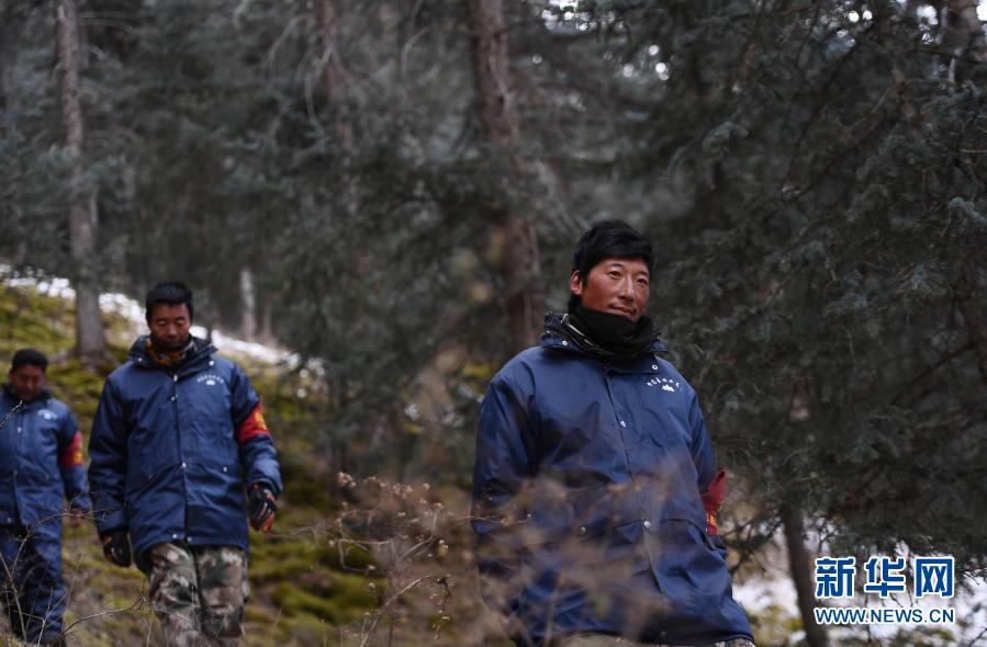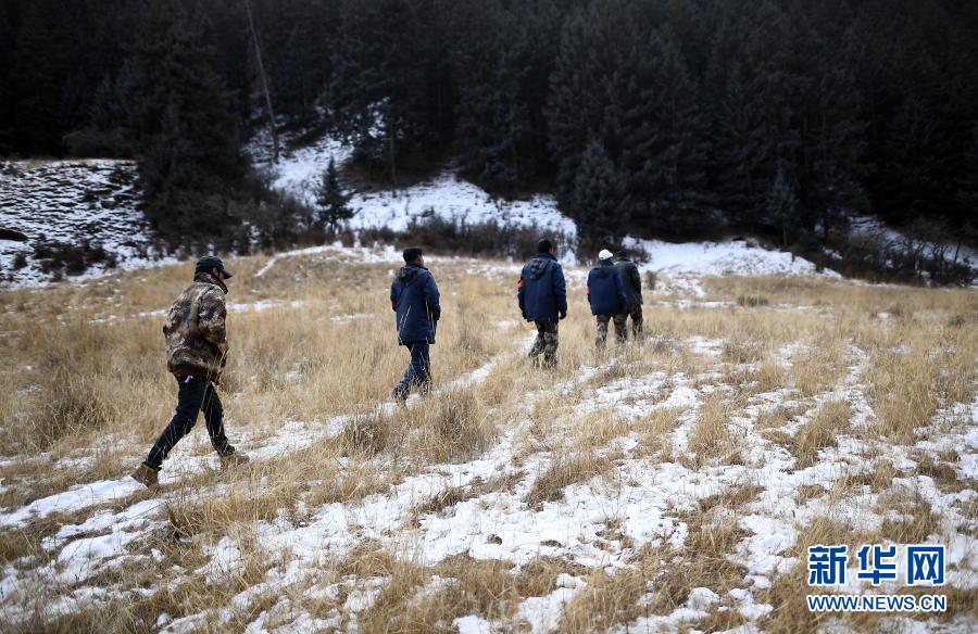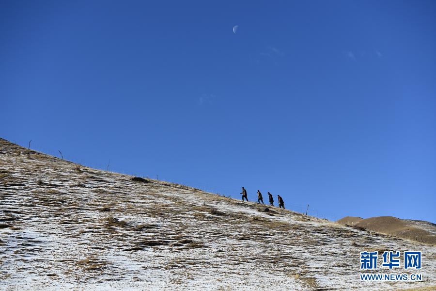 12月8日,祁連山國家公園紮麻什管護站生態管護員昂旦才讓(右一)和同伴們(men) 在巡護途中。新華社記者 張宏祥 攝