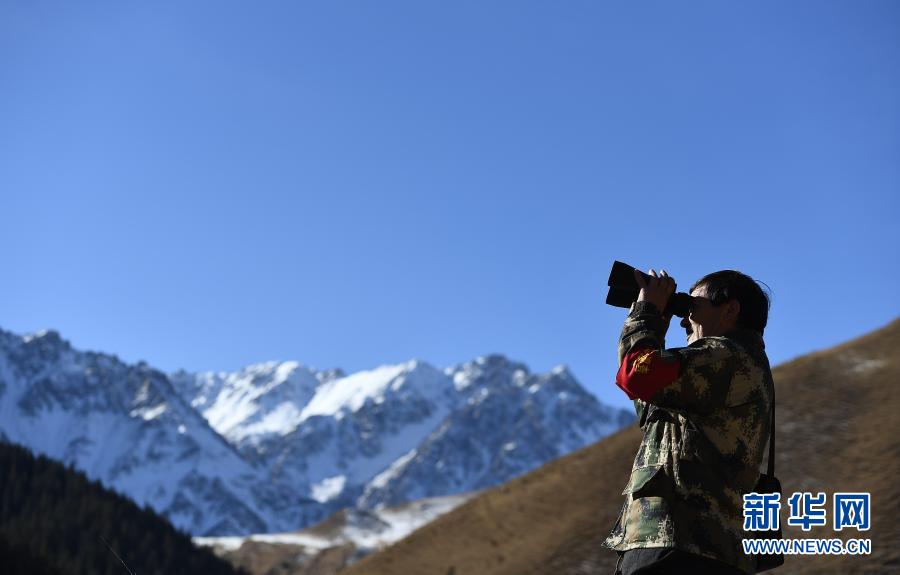 12月8日,祁連山國家公園紮麻什管護站生態管護員周曲才郎巡查途中使用望遠鏡。新華社記者 張宏祥 攝