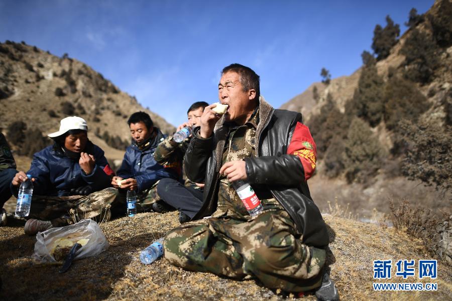 12月8日,祁連山國家公園紮麻什管護站生態管護員昂毛什加(右一)和同伴在吃午餐。新華社記者 張宏祥 攝