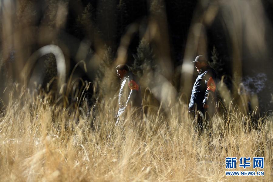 12月8日,祁連山國家公園紮麻什管護站生態管護員多傑昂秀(左)和同伴在巡護途中。新華社記者 張宏祥 攝