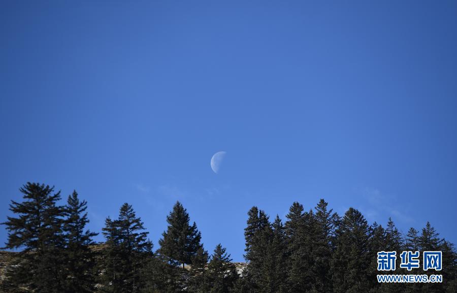 在青海省祁連縣,森林與(yu) 月亮相映成畫(12月8日攝)。新華社記者 張宏祥 攝