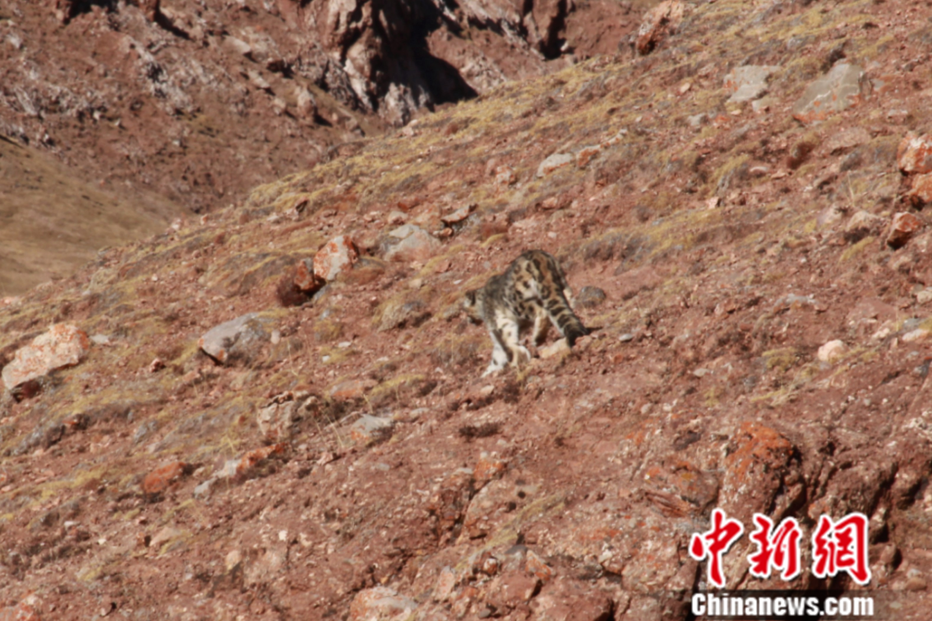 中新社記者看到,羅鬆紮西拍攝的動物臥在山坡上,酷似雪豹,但其皮毛顏色跟金錢豹接近,即呈現棕黃色,遍布斑點和環紋。