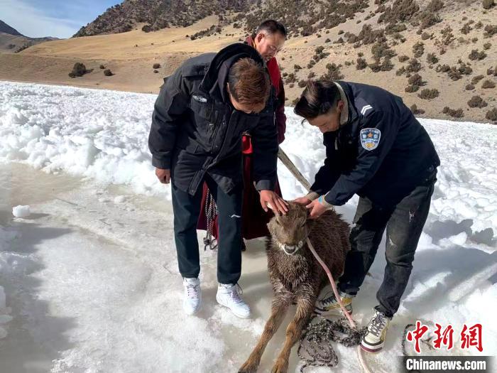 青海生態保護人員營救被困長江源冰麵一級保護動物白唇鹿